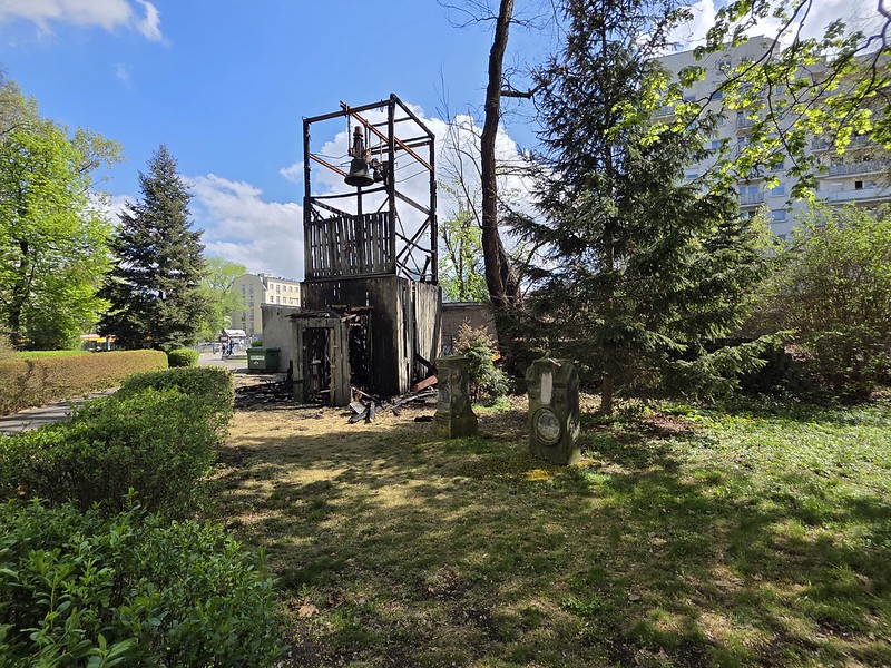 The two bells, one of which dated to 1772, did quite well not to fall down and so it seems that they can be repaired and there is some excellent documentation of the structure from a few years ago. I don’t know the official titles, but the heritage people have already been on site to work out how to fix the situation. Knowing Poland, it’ll be fixed the next time that I go by and I rather hope that it transpires not to be arson.
