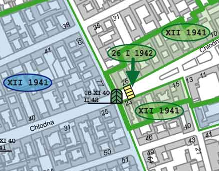 These maps are located in numerous places across the city, over-laying the location of the ghetto onto the current street plan. Leszno Street was one of the major pre-war streets enclosed within the initial ghetto boundaries established in November 1940. When the ghetto was effectively split into two sections (the “Small Ghetto” south of Chłodna Street and the “Large Ghetto” to the north) following boundary adjustments in late 1941 and early 1942, notably the exclusion of a section west of Żelazna Street between Leszno and Grzybowska Streets, Leszno Street remained a key east-west axis within the Large Ghetto.