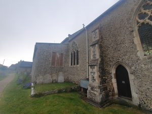 It started to pour with rain when Richard and I arrived at All Saints church in Weston Longville, which was unfortunately locked and even the porch wasn’t accessible. Perhaps it was just the rain, but it all felt a little stark and unwelcoming. Hopefully I will be able to visit the interior of this Grade I listed church in the future, as there are medieval wall paintings, a painted screen and a memorial to Parson Woodforde.