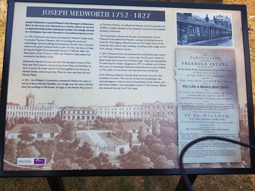 Joseph Medworth was born in Wisbech in 1752, the son of Simon Medworth and Anna Medworth (nee Lampson). He moved to London after being educated in the town, initially becoming a bricklayer but then working his way up to becoming a master builder. Medworth made some money and he then became a bit of a property developer and he constructed some impressive buildings on the site of the former Bishop’s Palace and Wisbech Castle, although the loss of that is unfortunate. It wasn’t though always Medworth’s intention, he was going to renovate the castle building and turn it into a school, but the plans were thwarted by the local authorities. Instead, he ripped the castle down and let other parts of it fall into decay, at which point the local authorities became more sympathetic.