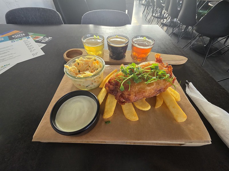 The fish and chips which was well presented, at the appropriate hot temperature and served as a generous portion size given the price. The fish had a richness of taste, the batter was quite crisp in places, but it was all suitably moreish and it went well with the beers.