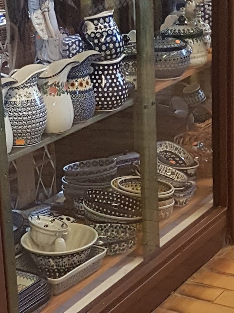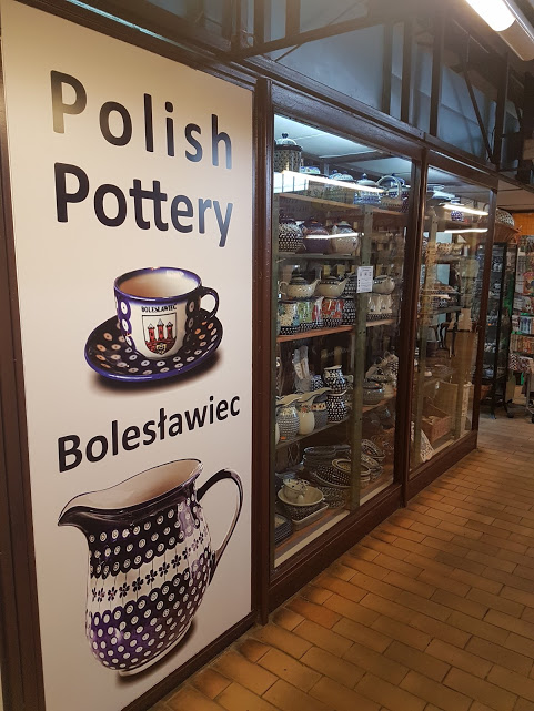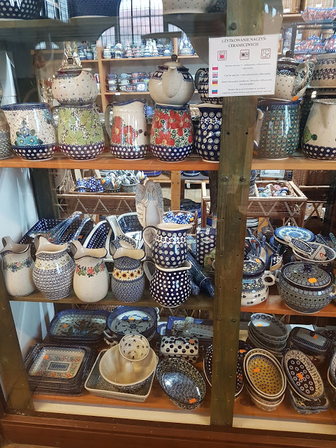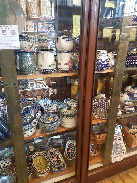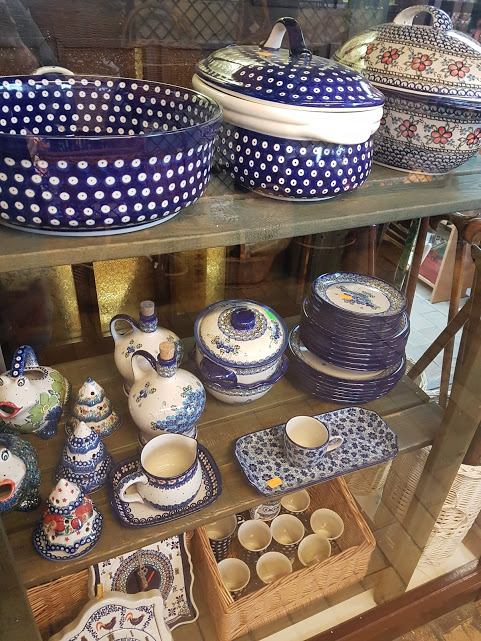 For those who love Polish pottery, some photos from one of the shops in Wroclaw which was selling it. The mention of Bolesławiec pottery in the top photo is the reason I post about this, as this traditional blue and white design comes from the town with this name. The town, which is a relatively short distance from Wroclaw, is now seen as the home of this type of pottery, which often also has some green and yellow elements added.