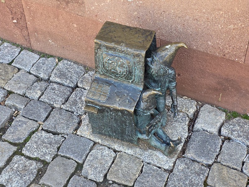 In the Gnomes of Wrocław collection, this is the Bankomatnik gnome, located next to an ATM. I’m not sure whether they’re repairing it or robbing it though….