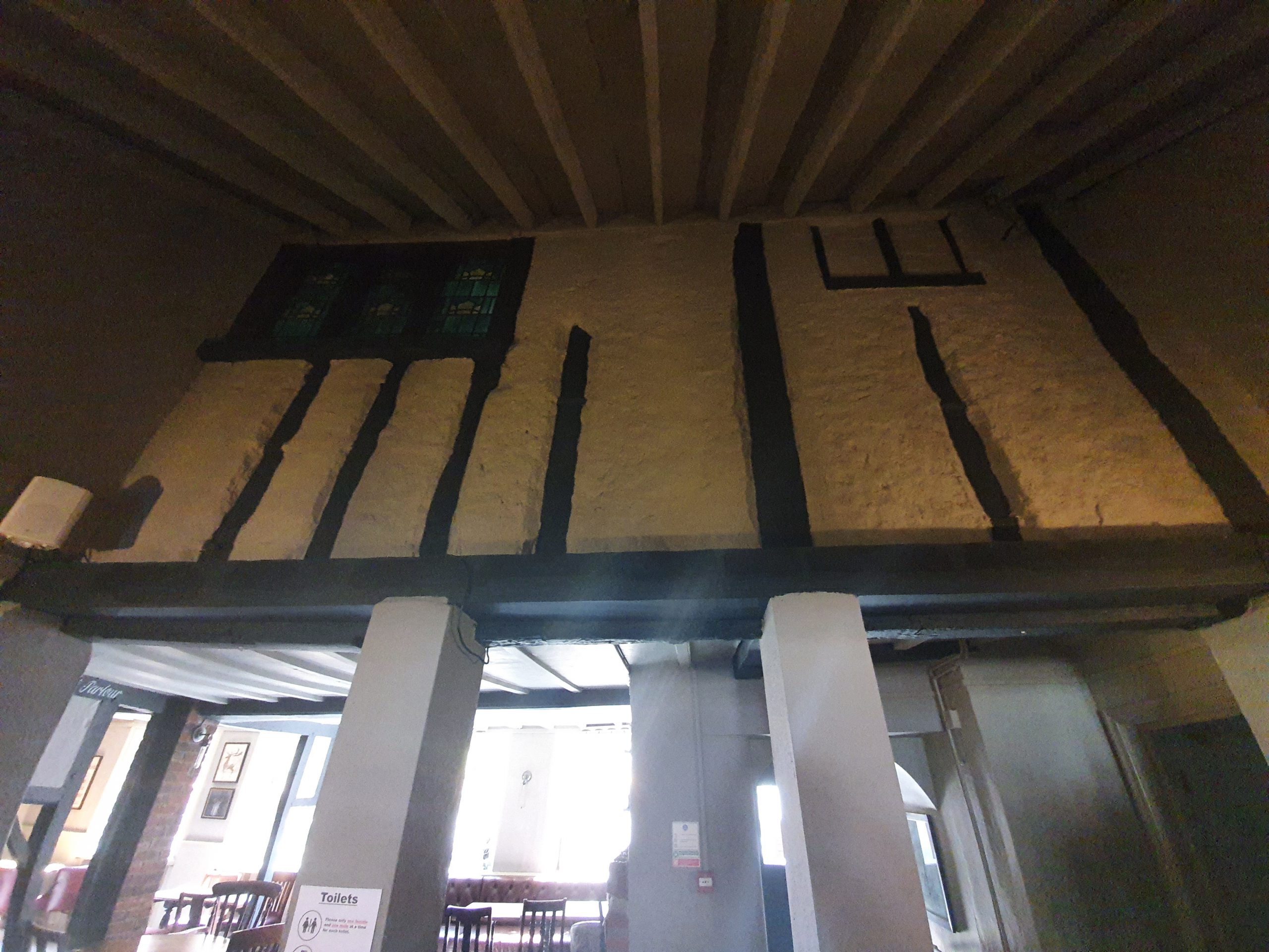 Within the building, the heritage of its time as a coaching inn is evident, I hadn’t expected such impressive interiors. The building was constructed in the early seventeenth century, likely after the fire which devastated much of the town in 1616. Originally, the above wall was the back of the wooden structure, but it was expanded backwards in the eighteenth century and that’s when the frontage was redone.