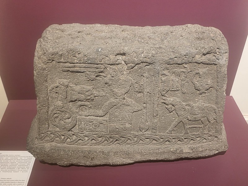 This is a tombstone from the fifteenth or sixteenth century, apparently made of andesite and that appears to have held up well. The museum notes that “there is a relief of a man facing forwards and holding a bowl towards a pitcher bearing an eternity symbol” although that feels like it’s missing out some explanation of what is being shown here. I thought that it was a hunting scene, but then again, I have no idea. And is that a horse looking down or an elephant looking up?
