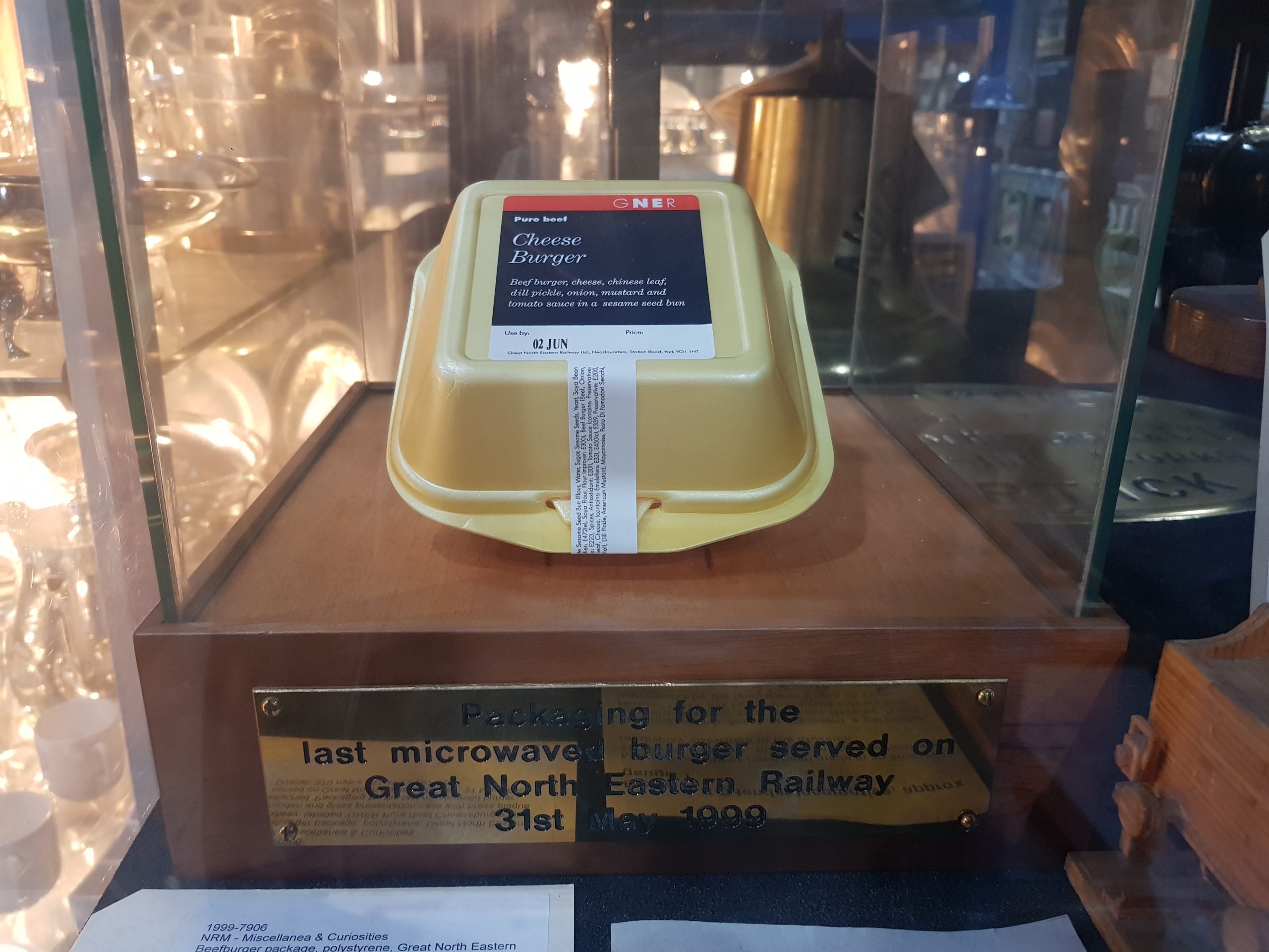 Not least because of exciting displays such as this, a little piece of culinary history. It’s the last microwaved burger container that was served on the Great North Eastern Railway line, the end of an era on 31 May 1999. Sounds rather nice (although I’m sure it wasn’t), a beef burger with cheese, Chinese leaf, dill pickle, onion, mustard and tomato sauce in a sesame seed bun.